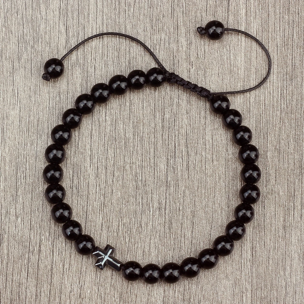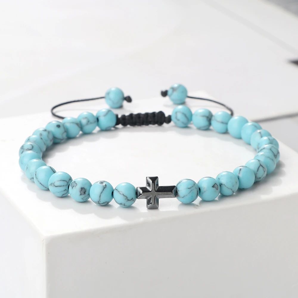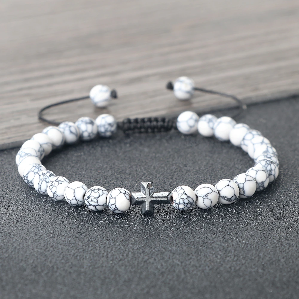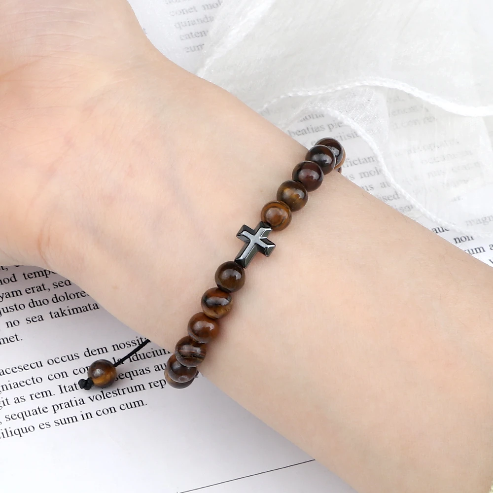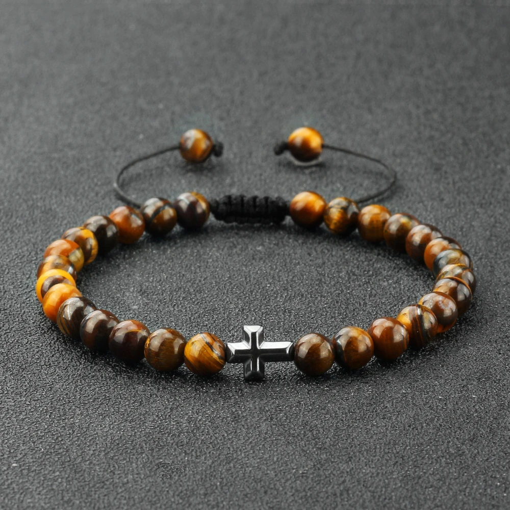 Prayer Men Handmade Woven Bracelet 6mm Natural Tiger Eye Stone Bangle with Hematite Cross Yoga Rosary Jewelry Homme Pulsera Gift